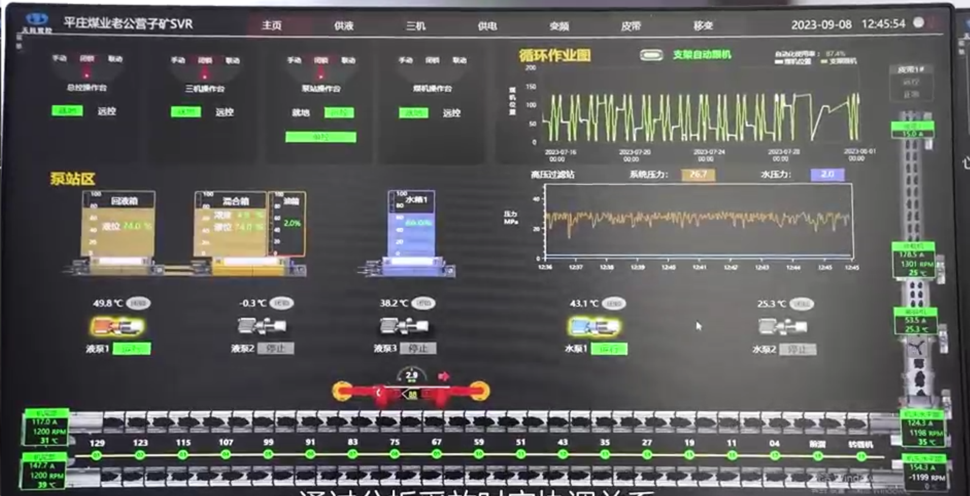 老公营子煤矿的主采煤层具有“煤层特厚、煤硬顶软、易自燃”等特点,在智能化开采实施中面临着综放开采含矸率高、智能化综放重型装备研制难、多重灾害威胁大等技术难点。项目组针对上述特点与难点,从采掘布置及工艺、智能化开采关键技术及装备、巷道围岩控制、安全保障、现场示范等方面划分6个课题开展研究。开发了“采—支—放—运”自主协调控制技术及关键装备,构建了分层综放工作面智能化设计及六大装备、六大辅助控制系统设计模型,形成了30m 厚煤层分层综放成套技术与装备,实现了远距离集中供液、一键启停、记忆截割、跟机移架、群组记忆放煤、采运协同等功能,建成了平庄煤业集团首个智能化综放工作面,使工作面作业人员减少30%,取消了夜班生产,提高了工人的幸福指数。