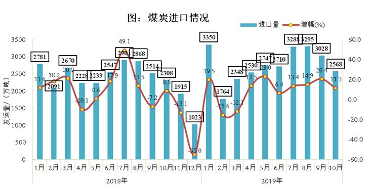 (二)供应增加。一是国内产量增加。1-10月份,全国规模以上原煤产量30.63亿吨,同比增长4.5%。10月份,全国规模以上原煤产量3.25亿吨,同比增长4.4%,增速与上月持平;日均产量1048万吨,环比减少32万吨。二是进口增长。前10个月全国煤炭进口2.76亿吨,同比增加2420.4万吨,增长9.6%;出口455.7万吨,同比增加62.2万吨,增长15.8%;净进口2.71亿吨,同比增加2358.2万吨,增长9.5%。10月全国进口煤炭2568.5万吨,同比增长11.29%,环比下降15.20%。三是铁路发送量增加。前10个月全国铁路发送煤炭20.3亿吨,同比增加6317万吨,增长3.2%(其中10月当月发送2.15亿吨,同比增加1412万吨,增长7%)。