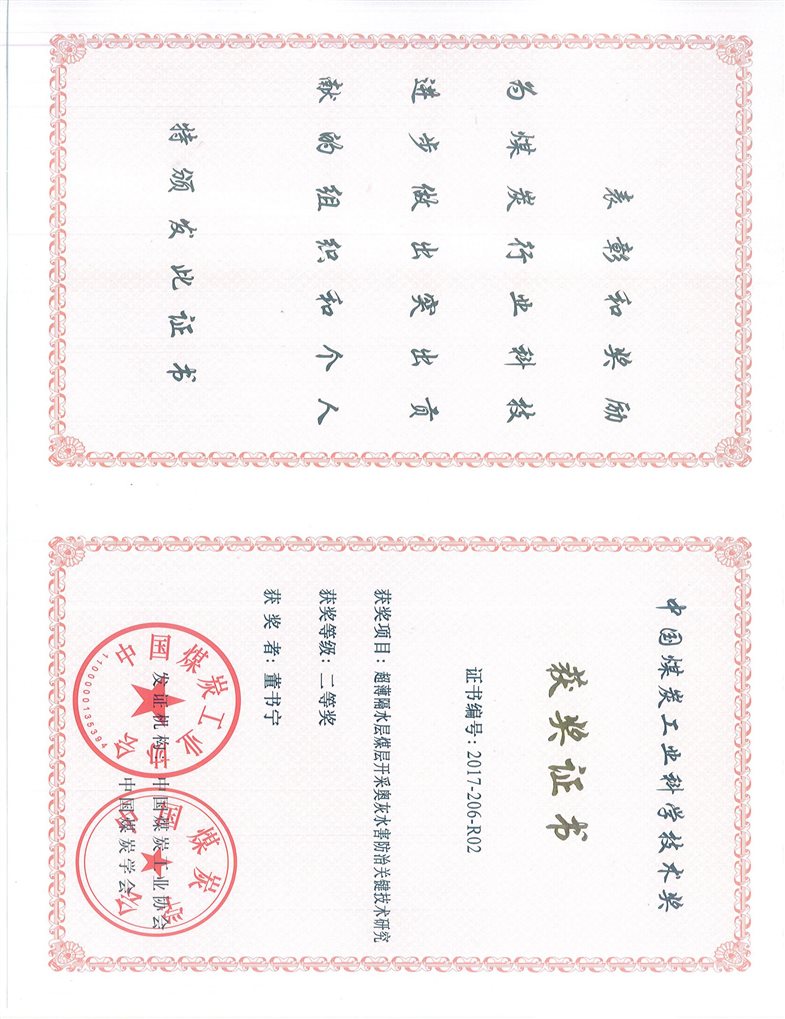 17.2018年中国煤炭工业科学技术二等奖--顶板巨厚含水层涌水机理及主动防控关键技术研究,排名第2;