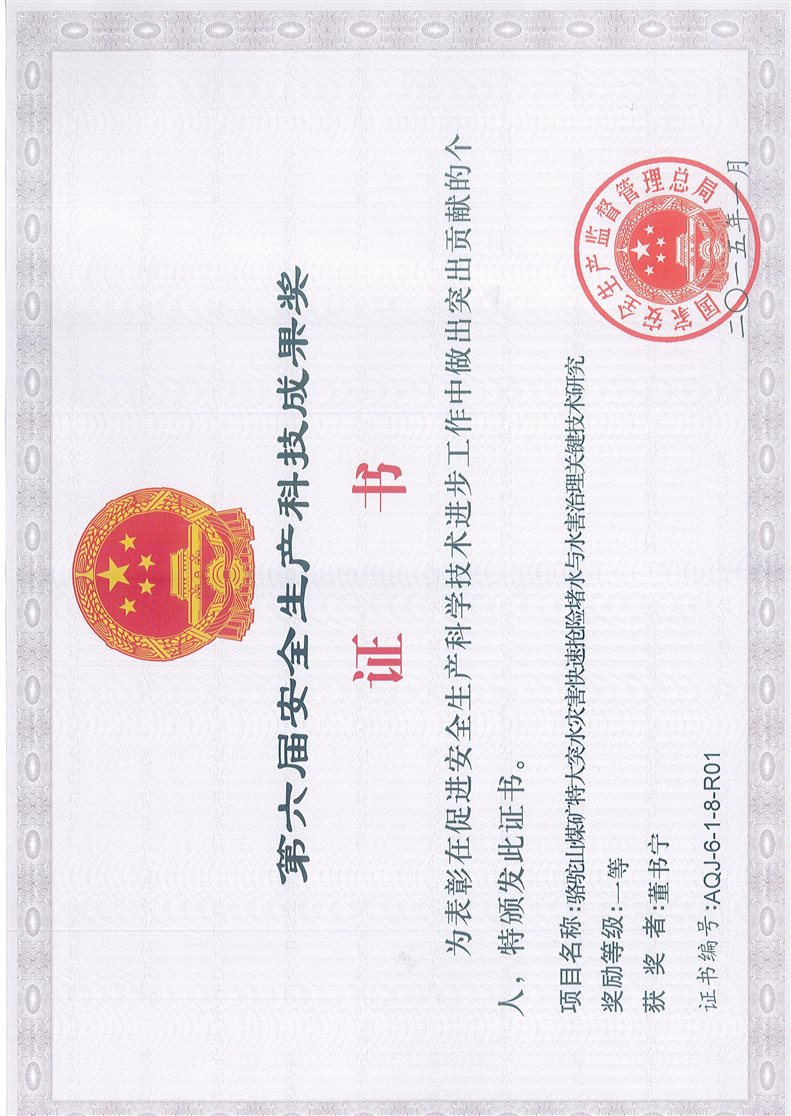 9.2015年第六届安全生产科技成果一等奖--骆驼山煤矿特大突水灾害快速抢先堵水与水害治理关键技术研究,排名第1;