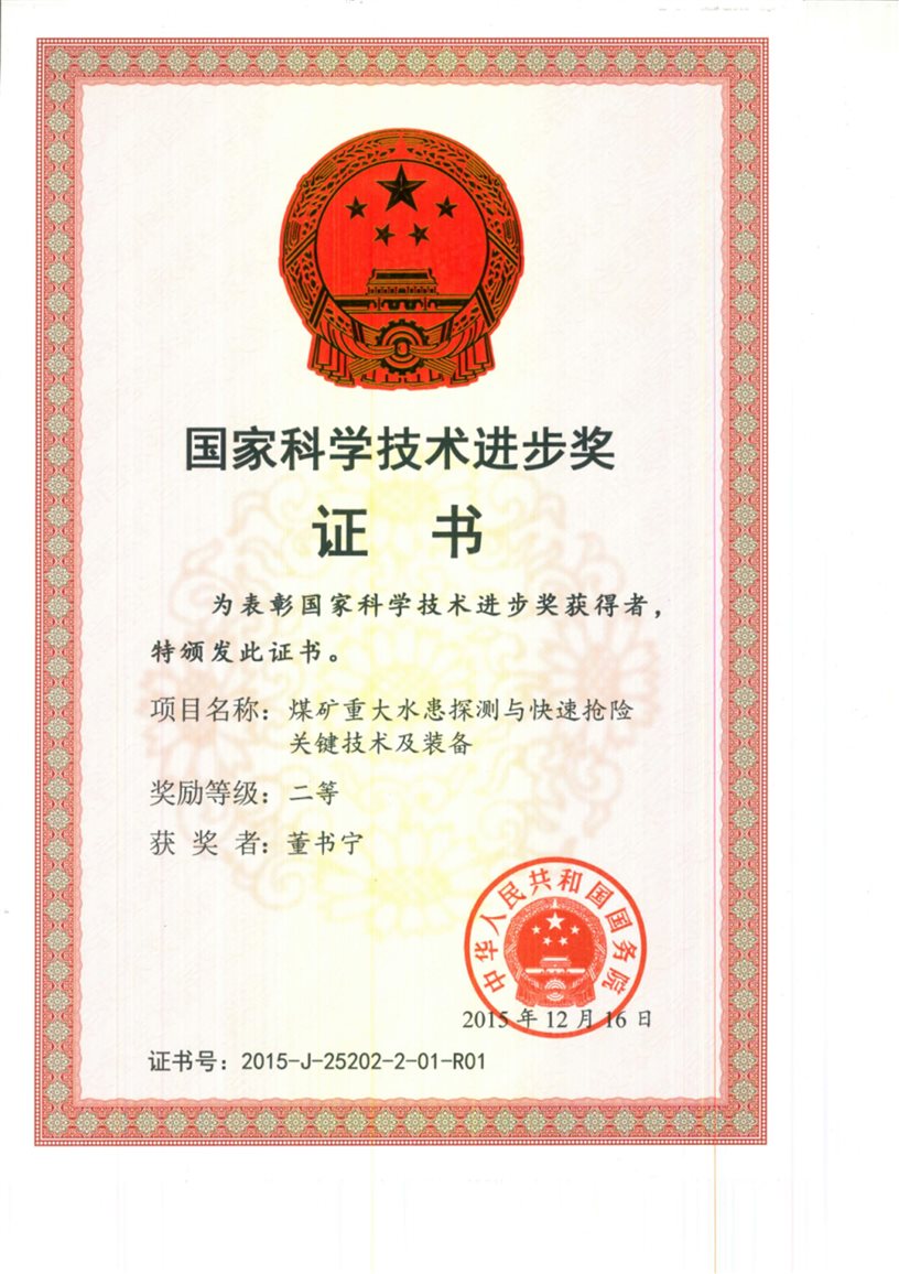 1.2015年国家科技进步二等奖--煤矿重大水患探测与快速抢险关键技术及装备,排名第1;