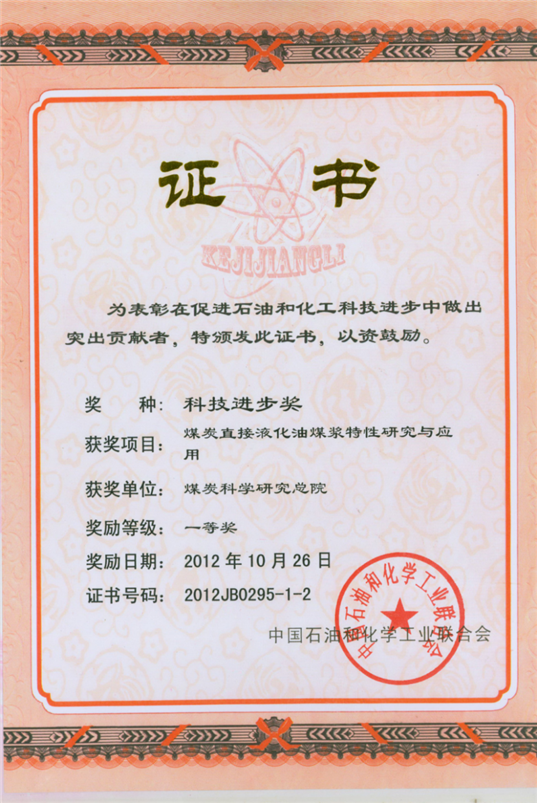 3 | 煤炭直接液化油煤浆特性研究与应用 | 中国石油和化学工业联合会科学进步奖 | 一等奖 | 2012 |