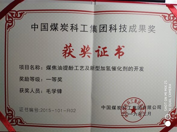 5 | 煤焦油提酚工艺及新型加氢催化剂的开发 | 中国煤炭科工集团科技成果奖 | 一等奖 | 2016 |