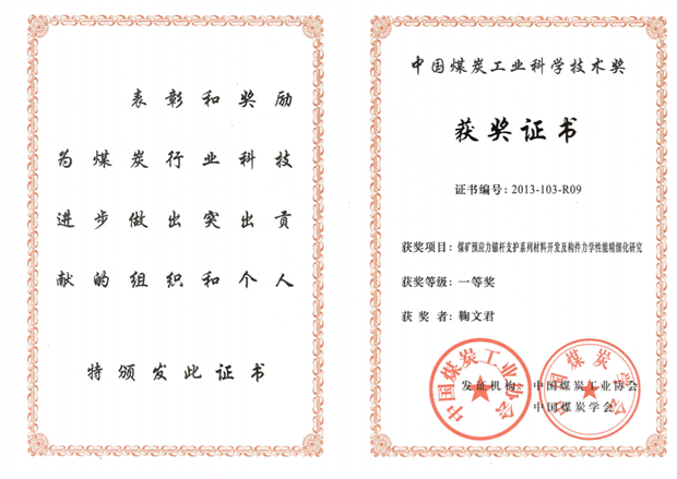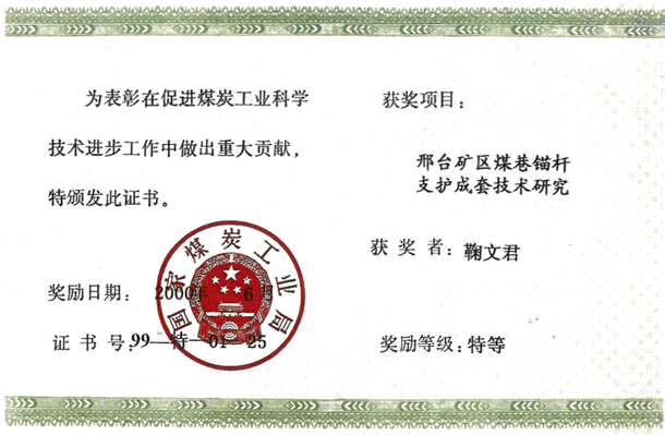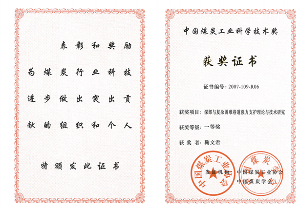 2、深部与复杂困难巷道强力支护理论与技术研究,中国煤炭工业科学技术奖一等奖,2007,排名6.