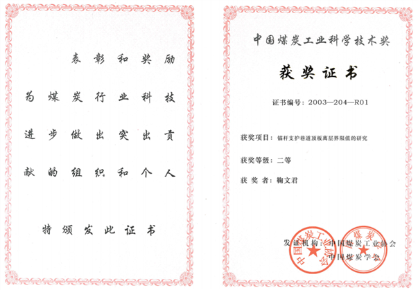 1、煤矿巷道高效安全支护成套技术创新体系及应用,国家科技进步二等奖,2005,排名10;