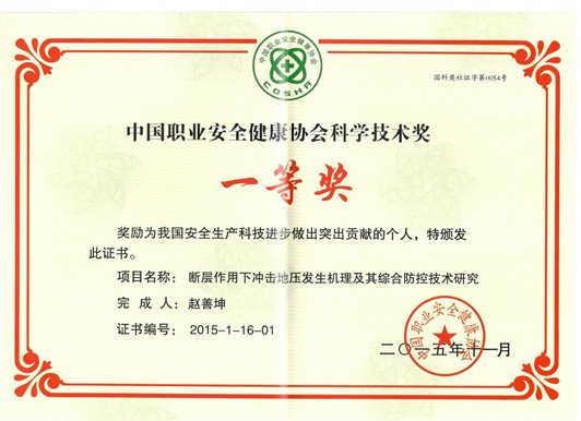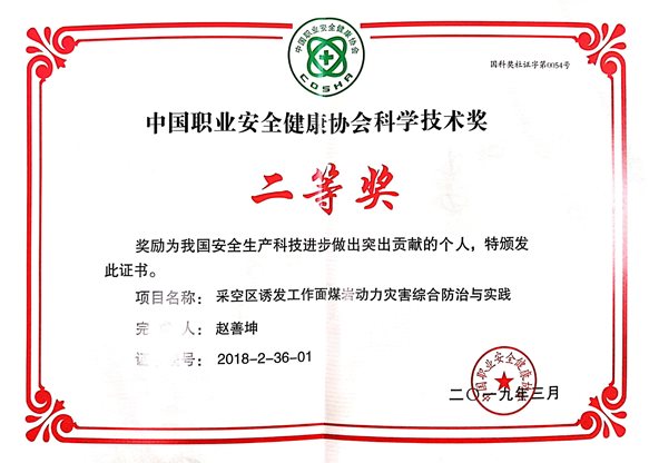 采矿区诱发工作面煤岩动力灾害综合防治与实践,2018年,中国职业安全健康协会,省部二等奖,排名第1;