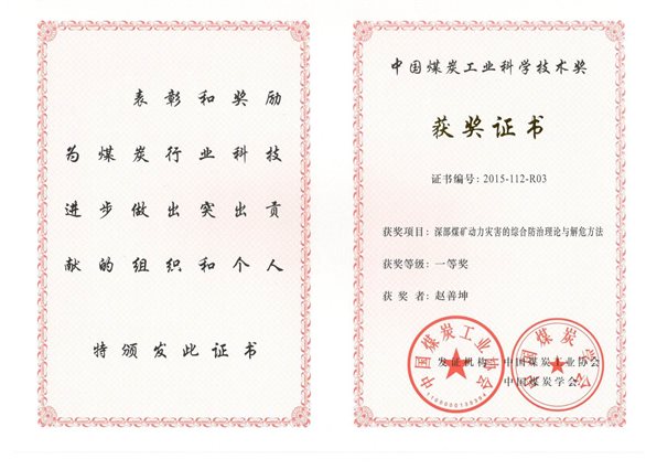 深部煤矿动力灾害的综合防治理论与解危方法,2015年,中国煤炭工业协会,省部一等奖,排名第3;