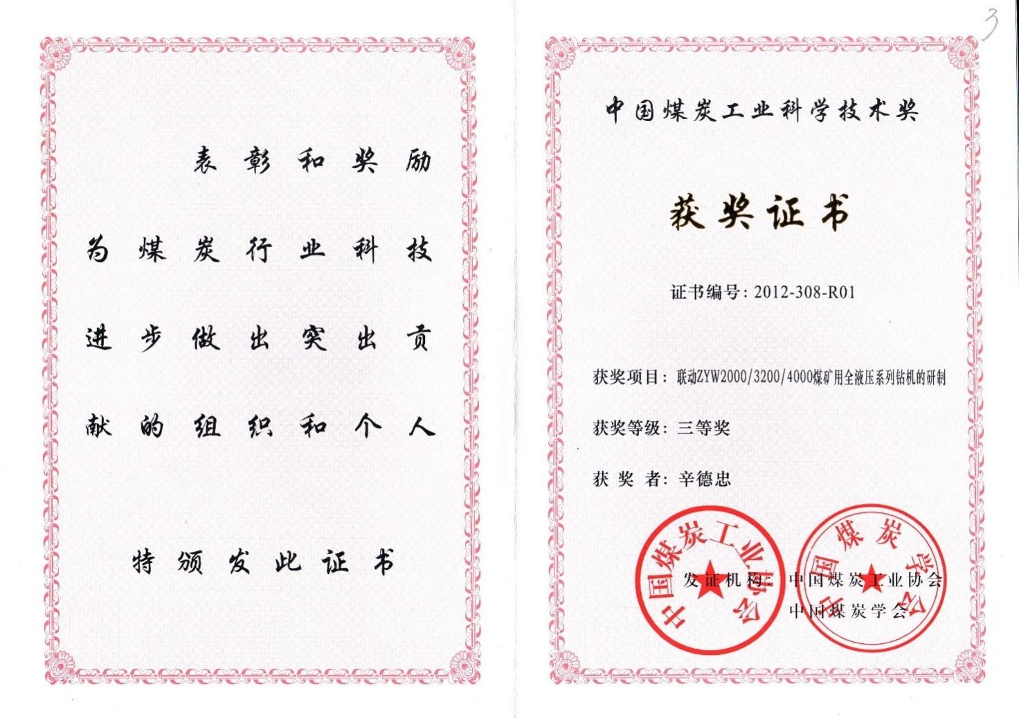 2、2012年“联动ZYW2000/3200/4000煤矿用全液压系列钻机的研制”获中国煤炭工业科学技术奖三等奖