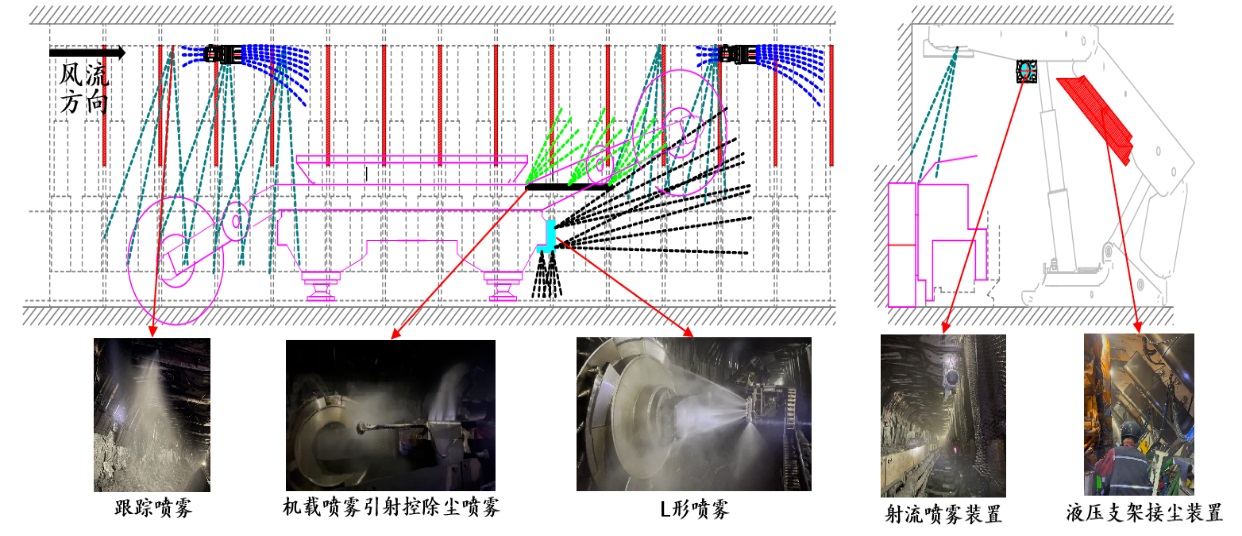 (1)提出了“滚筒密闭喷雾降尘+机载喷雾引射控除尘+液压支架导尘+射流喷雾隔尘净化”的粉尘防治成套工艺,研制了滚筒包络喷雾密闭降尘装置、机载喷雾引射控除尘装置、液压支架接尘装置、纵向雾屏隔尘净化装置等成套装备,实现了滚筒割截尘源的三维雾流密闭、片帮垮落冲击产尘的抽吸净化、液压支架架间落尘的隔离导移、立柱前后空间雾屏隔离和上部空间细微粉尘的高效捕集,最终实现了大采高综采面粉尘的有效治理。