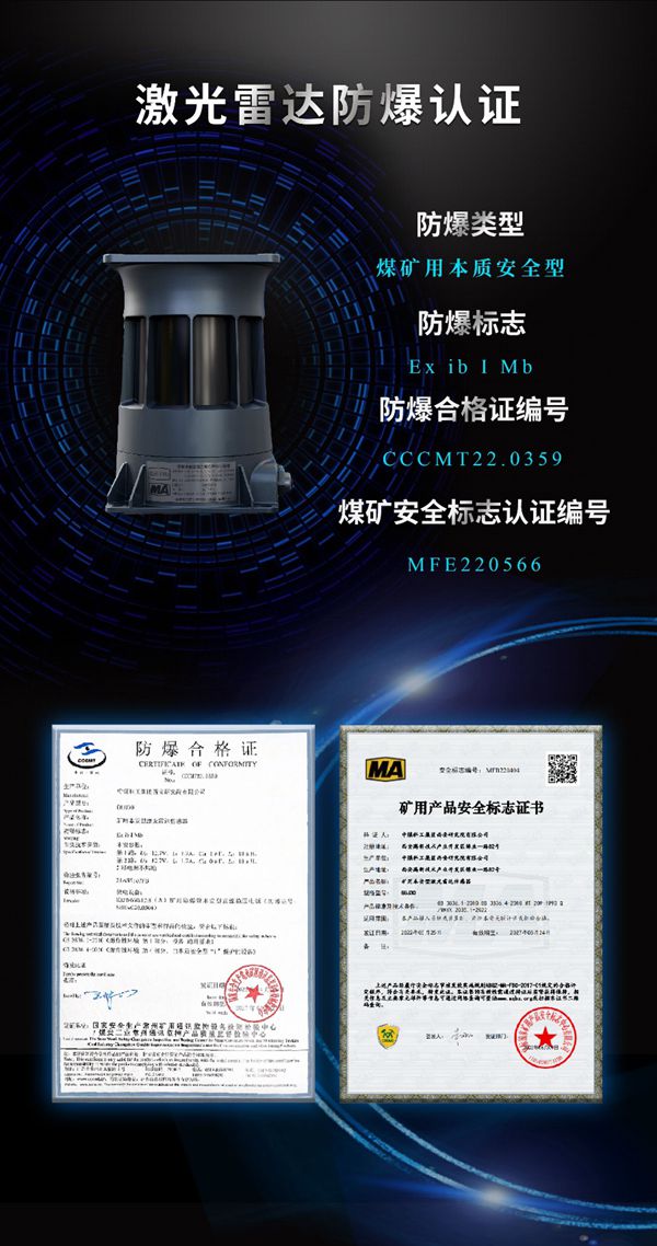 系统配套的高精度GUJ30矿用本安型激光雷达传感器集成了光纤通信、RJ45电口、IP67防护、I/O和RS485多种数据接口通信。其水平分辨率为0.9°,垂直分辨率为0.18°,测距精度为±3cm,结构精巧、美观大方、便携易装。获取点云数据时具备了高效采集、快速处理、和实时传输的实用性,保证了点云数据质量和点云三维建模的可靠性。同时,GUJ30矿用本安型激光雷达获得了国家防爆认证和煤矿安全标志双认证,且IP67防护等级使其适应于矿井各种复杂工况环境。