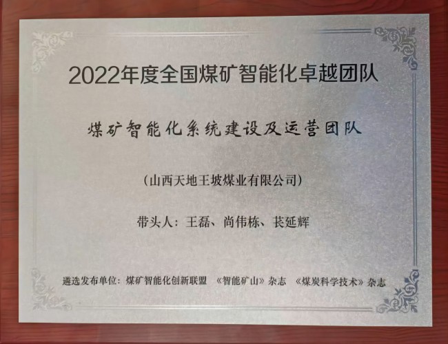 天地王坡1团队荣获“2022年度全国煤矿智能化卓越团队”荣誉称号