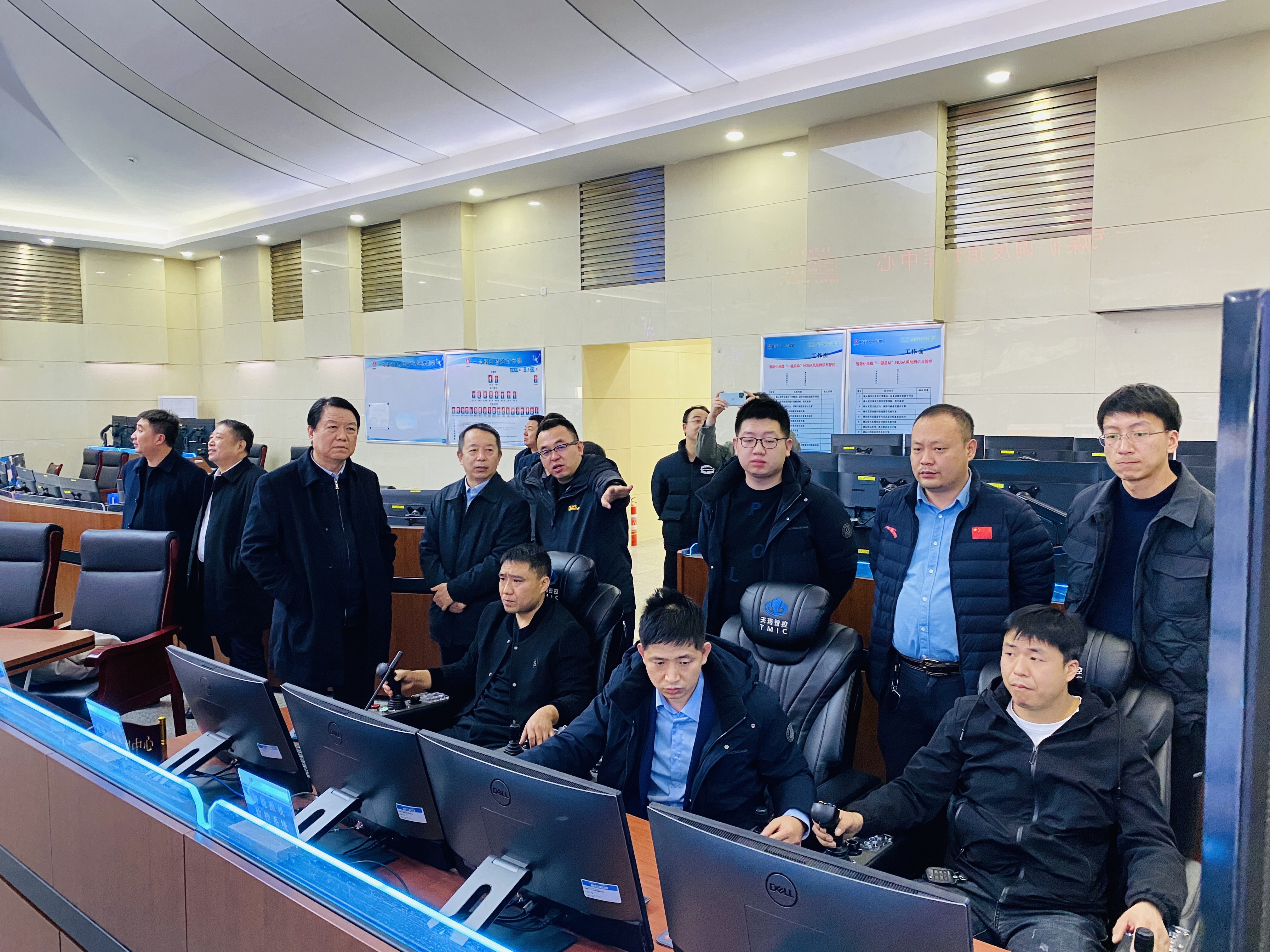 在黄陵一号煤矿调度中心,天玛智控“揭榜挂帅”黄陵攻坚团队汇报了当前项目进展与应用成果,范建一行现场观看三名地面采煤操作人员通过地面分控中心远程进行了井下采场区域全工作面的无人生产作业,与攻关团队成员、地面采煤操作人员进行了交流,详细了解自主规划截割、全阶段跟机自动、视频全方位追踪等技术,对项目整体运行效果给予了高度评价。